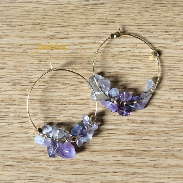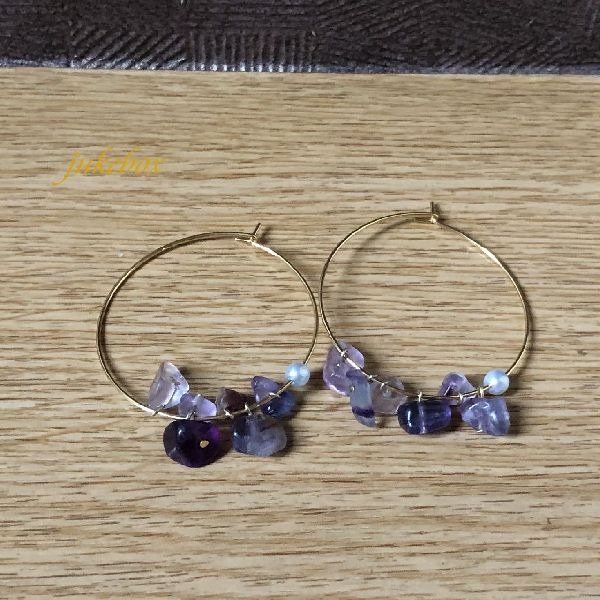 天然石ビーズ、フローライトをならべて紫陽花のようなフープピアスできました。